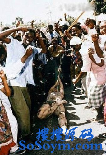 •   1993年10月4日下午,美国的电视屏幕反复出现了索马里人用绳子在地上拖着一具美国特种作战队员的尸体游街示众的画面,被俘的杜兰特也上了电视。这件事上了世界各大报纸的头版头条,美国舆论更是一片哗然。